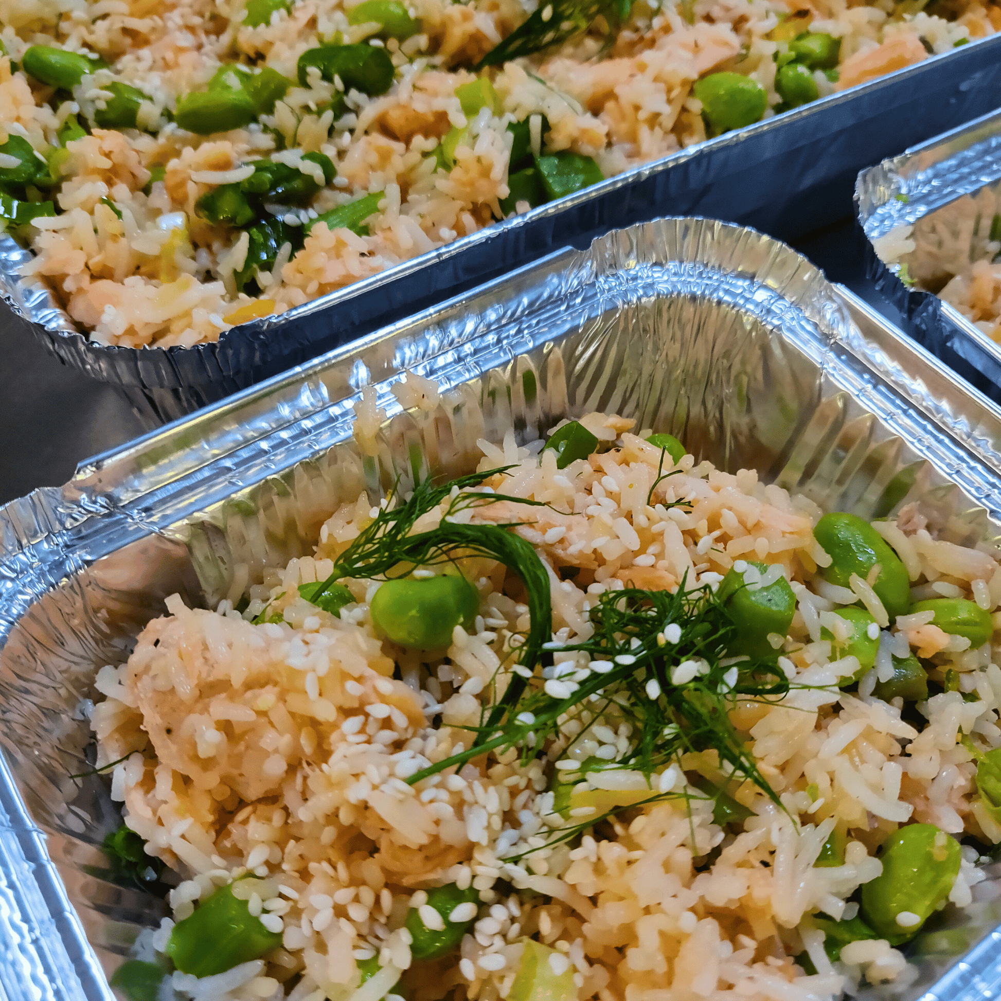 Delight in our Asian Salmon Rice, featuring deliciously roasted salmon with oriental seasonings, flaked into coconut rice and tossed with peas and asparagus. Sprinkled with sesame seeds and spring onion, this dish offers a perfect blend of flavors.