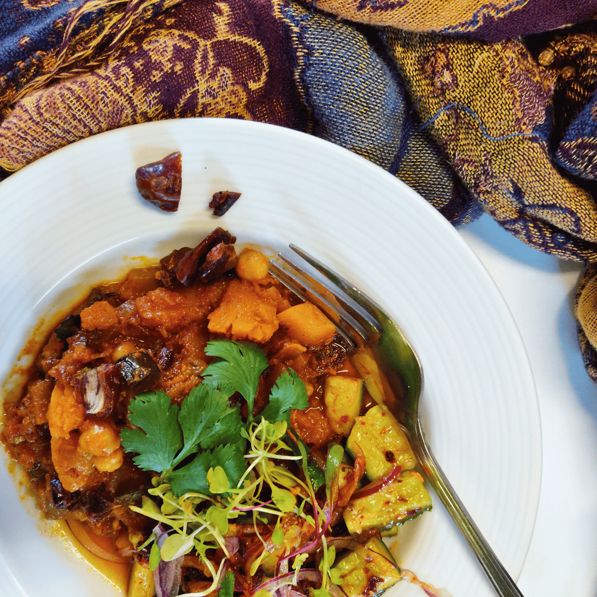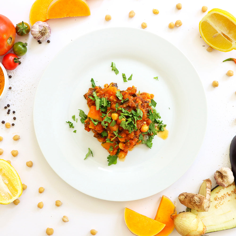 Brinjals, Dates, Coconut Oil, Chickpeas, Butternut, Lemon juice, Turmeric, Ginger, Onion, Tomato, Flat Leaf Parsley, Salt, Pepper