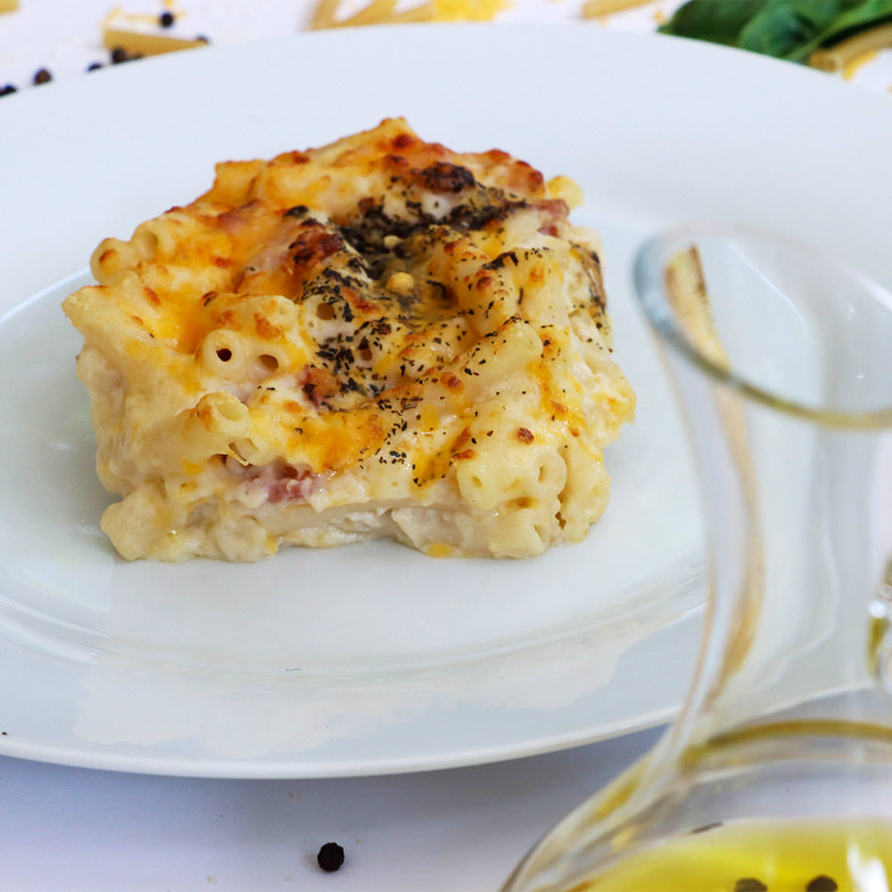 Enjoy our Cheesy Bacon Macaroni, a classic mac and cheese dish that's simple yet irresistibly delicious. Al dente macaroni tubes swim in a creamy mozzarella and bacon white sauce, topped with a cheesy, crispy golden top. The perfect meal to come home to - kids or parents!