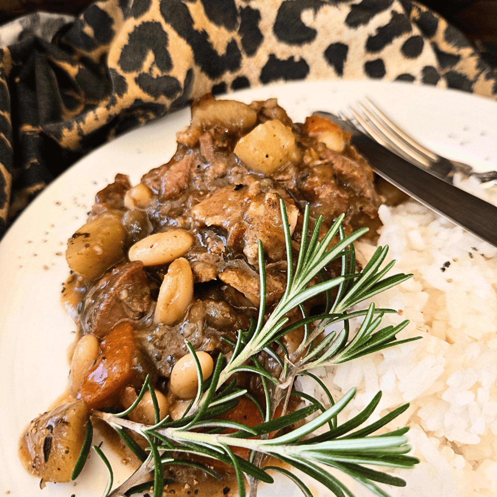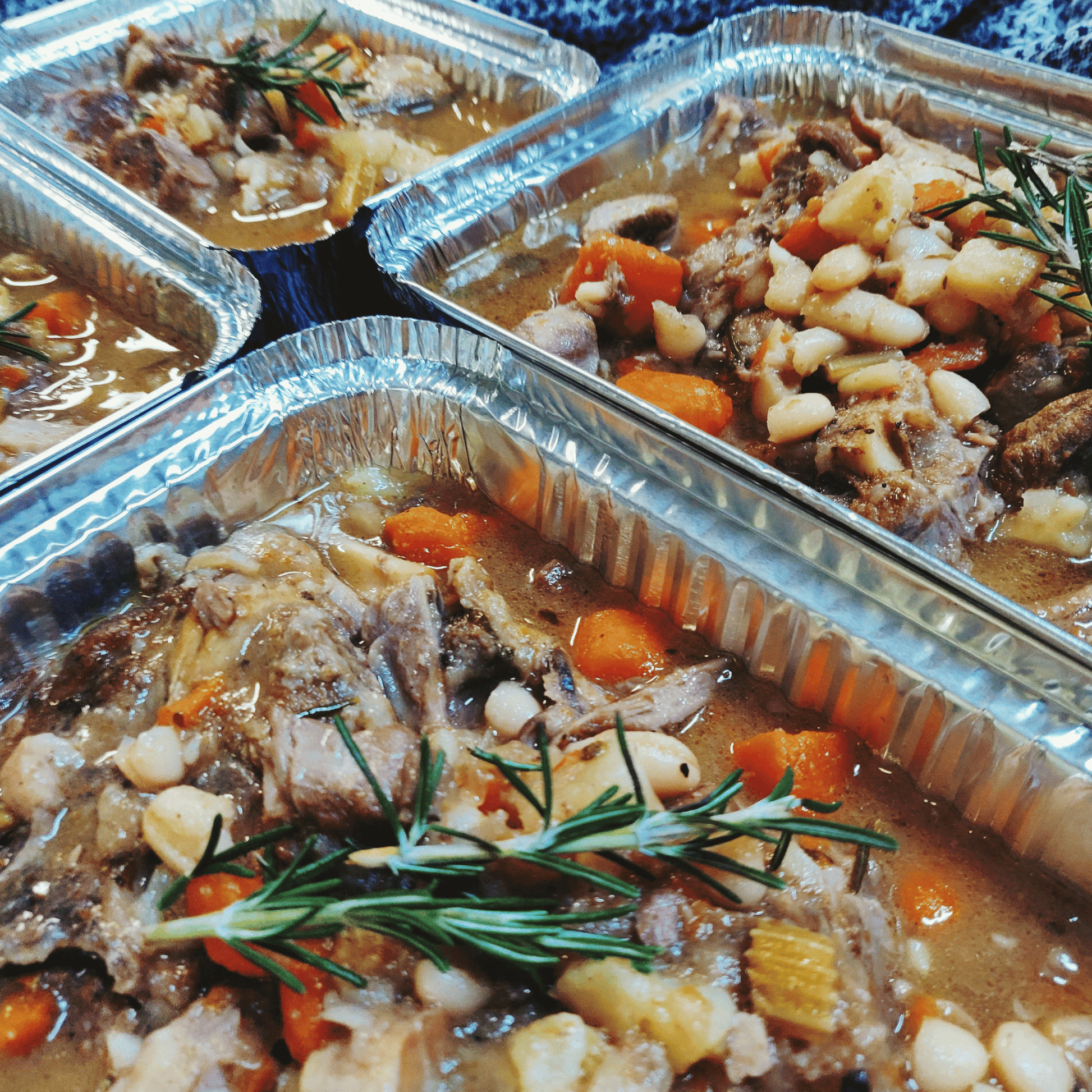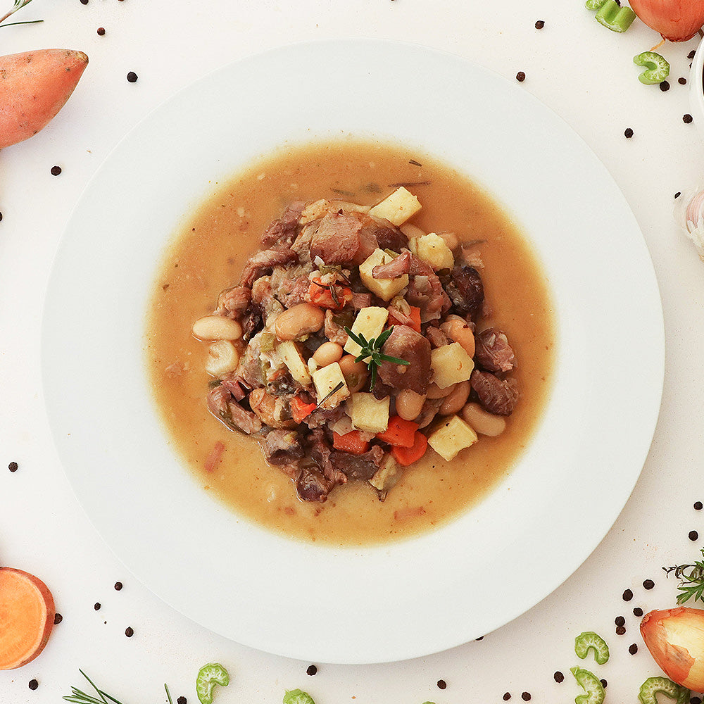 Lamb Neck, Lamb Knuckle, Sunflower Oil, Red Wine, Beef Stock, Rosemary, Garlic, Sweet Potato, Carrot, Onion, Celery, Cannellini beans
