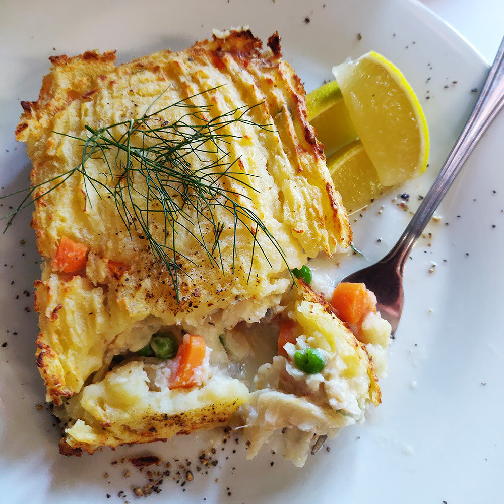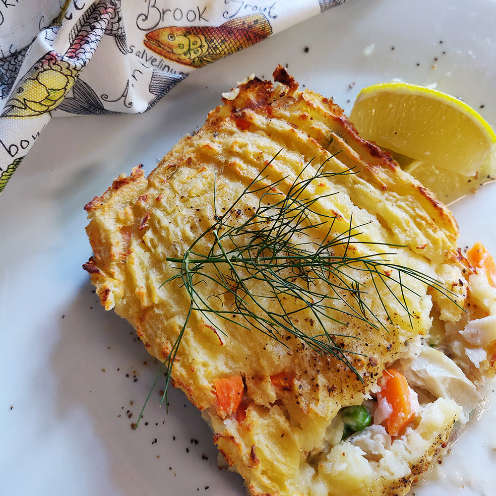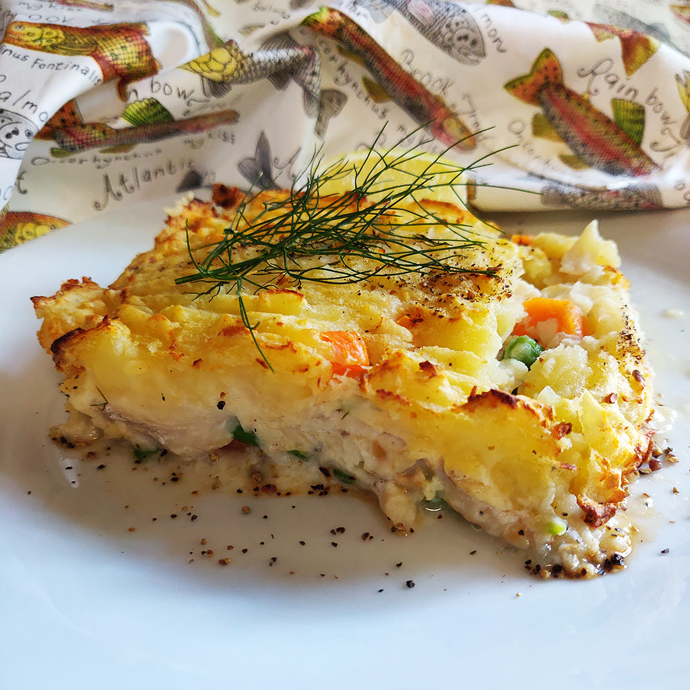 Savor our wholesome Hake and Vegetable Pie, a hearty classic. Our poached hake, carrot, and pea pie, with a herby white sauce, is topped with a golden brown potato rosti for all that great juiciness and crunch.