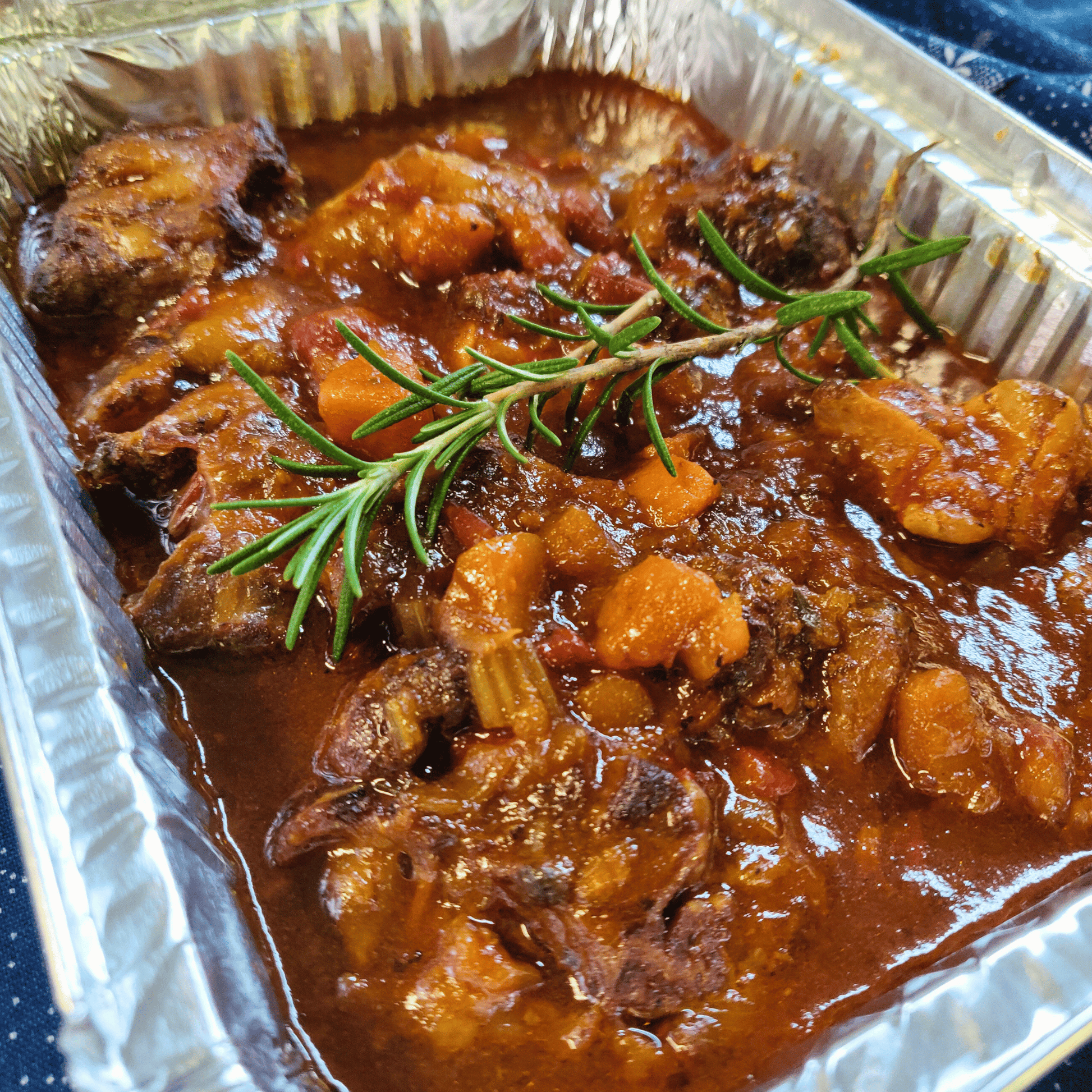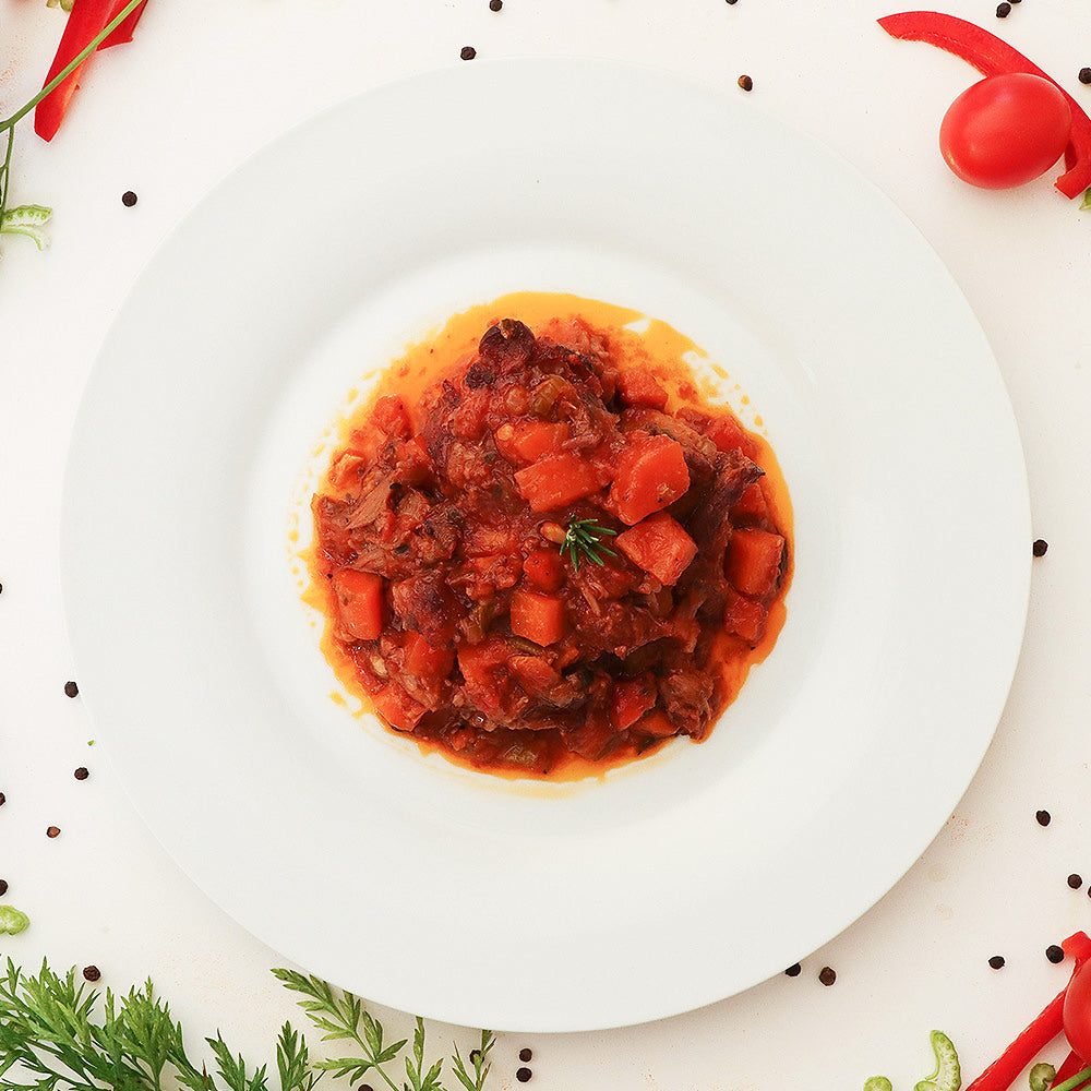 Oxtail, Sunflower Oil, Onion, Celery, Garlic, Red Pepper, Carrots, Tomato Puree, Rosemary, Thyme, Salt, Pepper