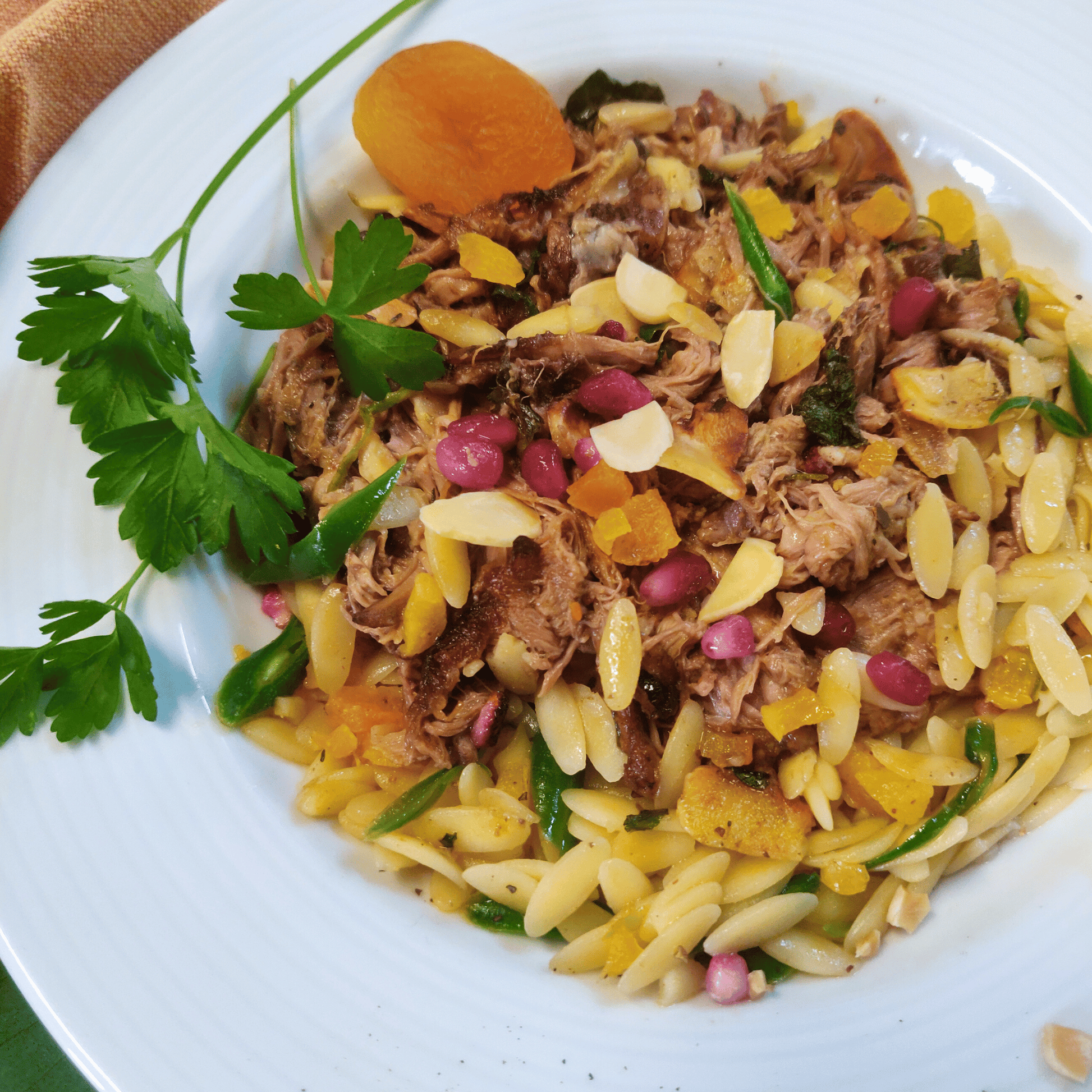 Overnight slow roasted lamb shoulder infused with Moroccan Spices, pulled and coated in a rich flavoursome gravy made from the wholesome roasting liquid. All this on a bed of orzo pasta rice that is tossed with green beans, Turkish apricots, almond flakes and pomegranate jewels.
